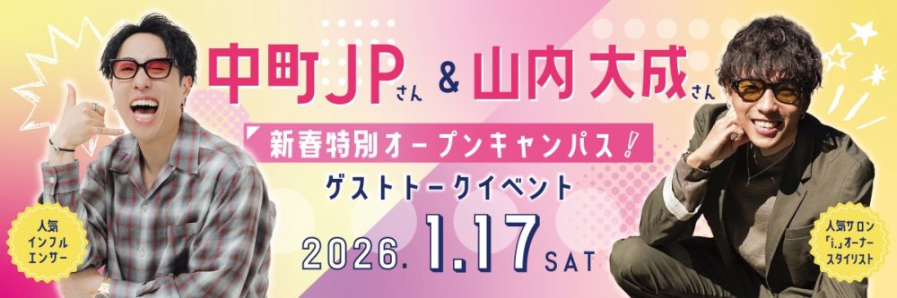 今回は新春特別企画として、これから美容業界を目指す高校生の皆さんの進路選択支援として、TGC MATSUYAMA 2024にも参加された人気インフルエンサー・メンズヘアサロンAli’iオーナー「中町JPさん」&人気サロンi.オーナースタイリスト「山内大成さん(愛媛県西予市出身)」をお招きした特別イベントを企画しました。美容業界だけでなく、エンタメ・ブライダルなど多方面と関係性のある当校だからこそできる特別なイベントをぜひご体感ください!