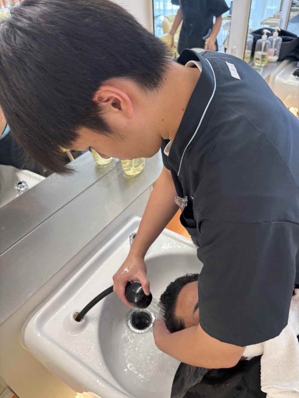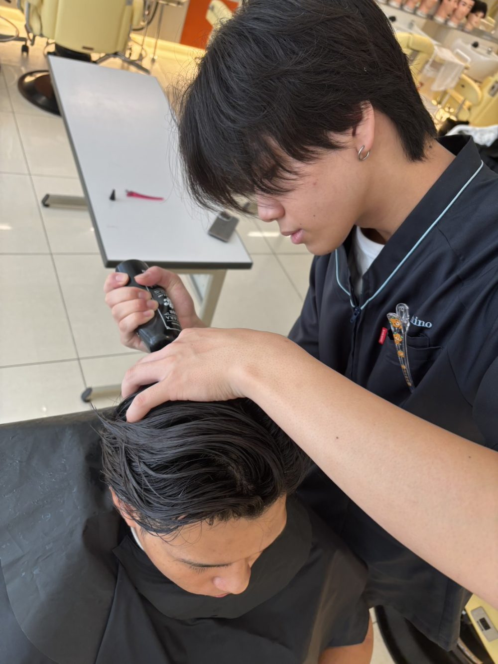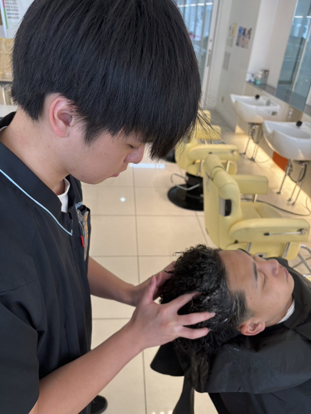 まずはお客様(モデル役)の頭皮の状態を確認し乾燥や皮脂(頭皮の脂)のつまりなどを見ます。