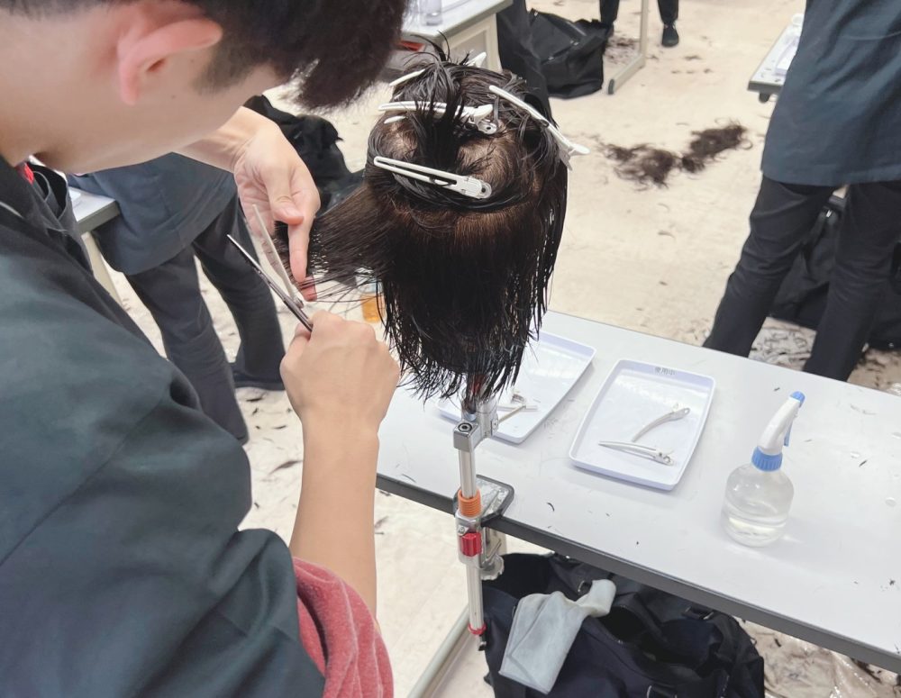 人の頭を模したウィッグでどこを分け取って切っていくか、