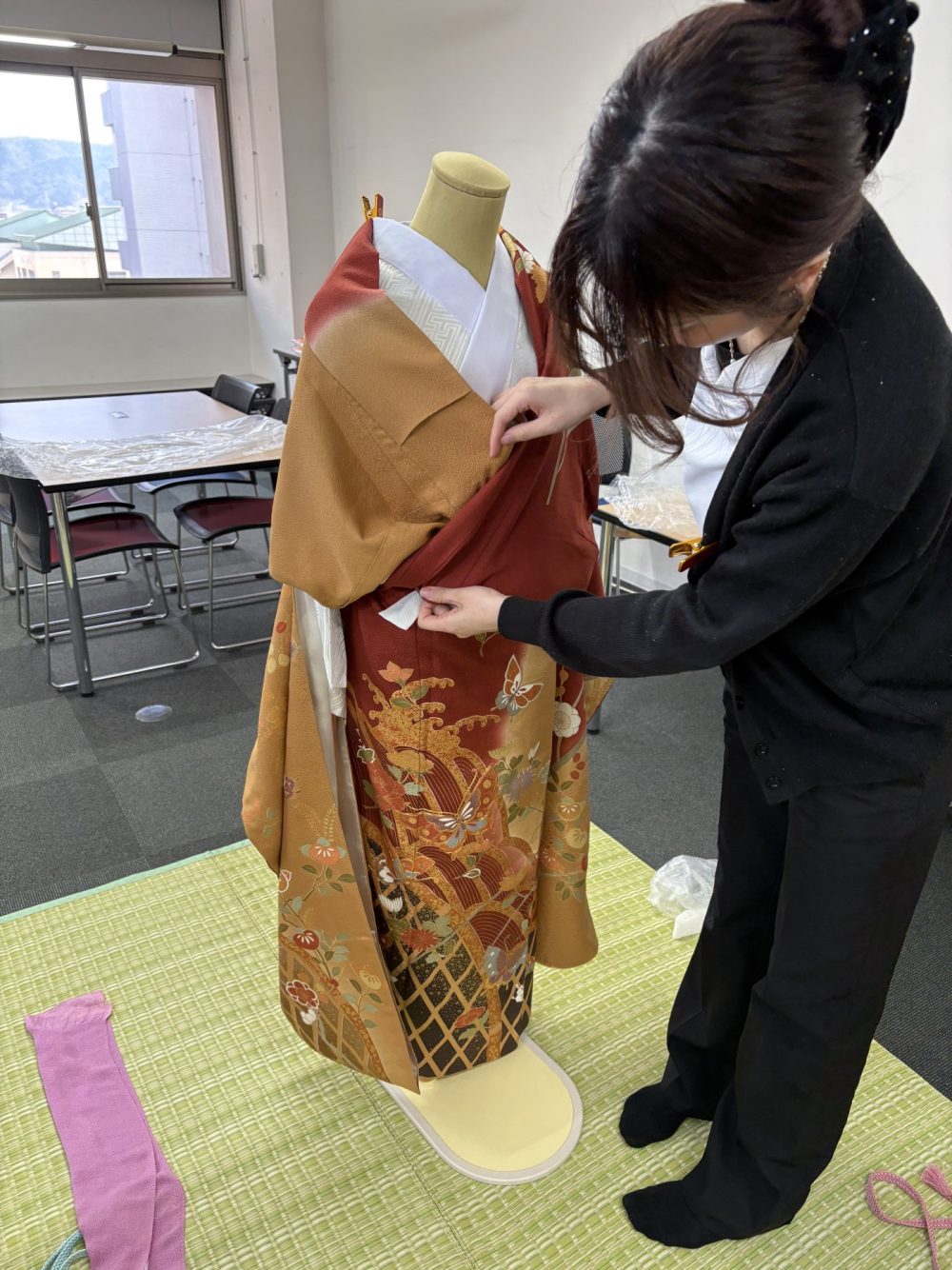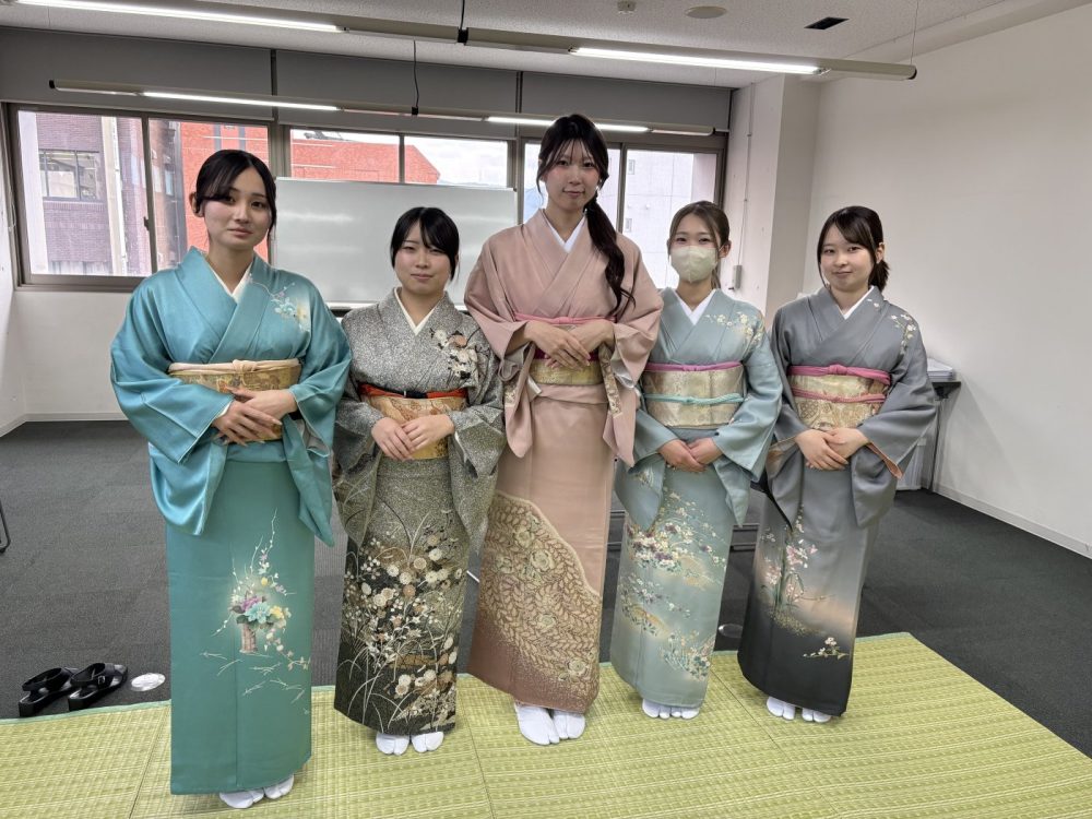 最後の着付授業で振袖の着付けを練習✰