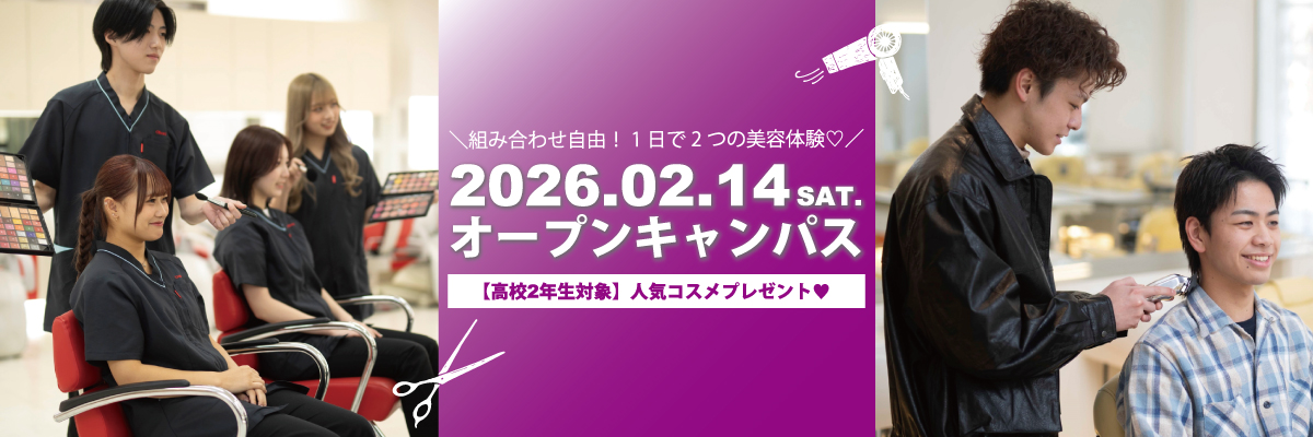 EVENTイベント トップ > イベント > オープンキャンパス > オープンキャンパスのご案内 オープンキャンパスのご案内 オープンキャンパス2026年2月14日 10:00 AM - 1:30 PM 10時00分-13時30分 開催予定 9つのメニューから2つ選べる美容体験オープンキャンパス開催<人気コスメプレゼント付き♥> POINT ◆【高校2年生対象予約参加特典】Dior/JILLSUTUART/ReFaコスメプレゼント◆充実の美容体験~9つのメニューから2つ体験~◆KBMオリジナルグッズプレゼント!◆総合型選抜入試エントリー資格認定・付与!◆愛媛県内各地から無料送迎バス運行!◆東予・南予・県外からお越しの方へ交通費一部補助あり◆お車でお越しで保護者様もご参加された方へは一部駐車場代負担◆無料ランチ付き♪ 【重要】予約参加特典について ※2026年1月21日10:00更新 高校2年生対象の予約参加特典のコスメプレゼントにつきまして、連続企画として10月~12月で各月1回ずつ実施しておりました。お一人でも多くの方に特典が届けれるようお一人様1回限りとなりますので、10/11(土)・11/15(土)・12/13(土)・2/7(土)開催のオープンキャンパスにて特典付与しました方は今回は対象外となります。なお、オープンキャンパスの参加自体に制限はございません。ご理解のほど、よろしくお願いいたします。 体験メニュー 体験①「カット」 カット基本技術を修得!~グラデーションカット編~ 基本的カット技術の1つ!女性に人気のショートスタイルに樺らず使うカット技術を体験してみよう♥ 体験②「メンズカット」 THE!BARBER! ちょっとヤンチャでカッコイイコーンロウを体験してみよう🔥🔥🔥 体験③「カラー」 デザインカラーに挑戦! 垢抜け感のあるおしゃれで人気なウィービングやイヤリングカラーを作ってみよう♡ 体験④「マツエク」 オシャレを楽しめる!カラーマツエク体験 マスカラやつけまつ毛と違った目元の魅力をカラーで引き出せ!カラーマツエクを体験しよう! 体験⑤「ヘアアレンジ」 韓国風オルチャンアレンジ♥ 今トレンドの“韓国ヘア”にチャレンジ!人気のくびれ巻きや女神ヘア(ヨシンモリ)を作ってみよう♥垢抜けた印象にできるちょっとしたテクニックを伝授! 体験⑥「ワインディング」 ワインディング早巻き対決! 学生スタッフとペアを組んで、センターの早巻き対決!優勝者には豪華景品!?をプレゼント♥ 体験⑦「メイク」 ピンクアイシャドウであざと可愛い♡メイク体験 苦手な人が多いピンクのアイシャドウを使ったメイクにチャレンジ!ポイントでの入れ方など、お家でも実践できる方法をマスターしよう♥※【施術する側・施術してもらう側】選べます♡※施術してもらう側…メイク施術をしますので、可能な限り薄っすらメイクでご来校ください。 体験⑧「ネイル」 ジェルネイルでバレンタインネイルチップ作ろう💅🌈 硬化してデザインするジェルネイル!ピンクや赤などのバレンタインカラーでネイルチップを作りましょう♥※作ったものはお持ち帰りOK! 体験⑨「エステ」 チョコレートハンドパック🍫 癒しの世界🌼ハンドケアとチョコレートパックで保湿ケアを楽しみましょう!!! \高校2年生の皆さん/河原ビューティモード専門学校では毎年10月から高校2年生向けオープンキャンパスへ移行しています!「進路決定はまだまだ先じゃん…」と思っている方も多くいるのでは?「美容学校はどこも同じ…」と思っている方もいることでしょう!来年の進路決定に向け、あなたに合う分野探し&学校探しをこの秋からスタートさせましょう♥ 「美容が好き!」「メイクが好き!」「オシャレが好き!」「美容職に興味がある!」「どんな職業かもっと知りたい!」KBMは充実の9つの美容体験から2つ選べるオープンキャンパスなので、それぞれの思いが解決できること間違いなしッ♡オープンキャンパスに参加して進路参考にしましょう😊保護者の皆さま向けに「保護者説明会」も同時開催♪専門スタッフが進学費用や入試情報など詳しくご説明していますので、ぜひ保護者の方もご一緒にご参加下さい! ★★★さらに!嬉しい参加特典★★★🤍KBMオリジナルグッズをプレゼント🎁🤍LINEスタンプラリーを5ポイント貯めて、スタバカードやマックカード1000円分をゲット→詳しくはこちらをクリック タイムスケジュール 10:00〜 受付開始 10:30〜 オープンキャンパス開始😊 10:40〜 体験授業♪選べる9体験♡ ※保護者説明会も同時開催 12:20頃 ランチ(軽食をご⽤意しています♪)学校説明・入試説明 13:00~ 個別相談 学生スタッフからもキャンパスライフについても聞けちゃいます★ 13:30 オープンキャンパス終了! またのご参加をお待ちしています♪ PICK UPもうすぐ開催! 2026年2月14日 10:00 AM - 1:30 PM 2026年2月7日 10:00 AM - 1:30 PM SEARCHタグから記事を探す 入試情報 NEWS 行事 スクールライフ オープンキャンパス 個別相談会 Wライセンス
